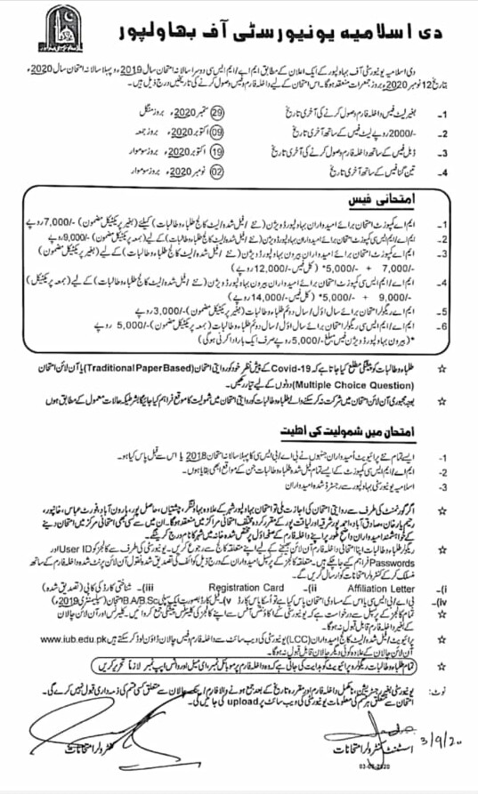 Apply For MA and MSc 1st 2019 and 2nd Annual Exams 2020 of The Islamia University of Bahawalpur .