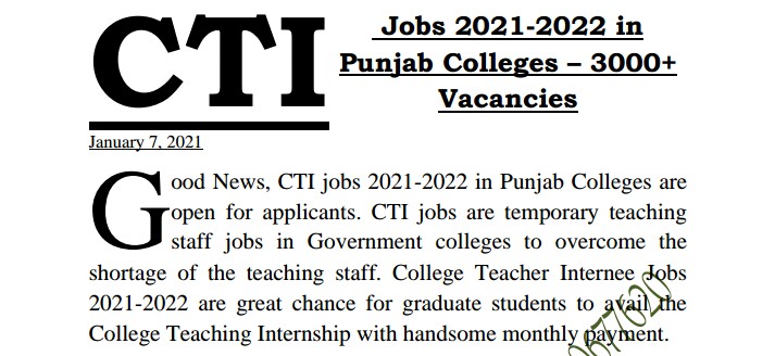 How to Apply in Education Department CTI Jobs 2020 These Jobs are advertised by the government of Punjab for government colleges in Punjab. Education Requirement and Experience shall be Calculated / Examined as on the last date of applications. Applicants with Higher / Extra education qualification and experienced will be preference. Filling up of vacant teaching posts- Hiring of college teaching interns (CTIs) I am directed to refer to the subject cited above and to State that in order to overcome the Shortage of teaching staff in the colleges of Punjab, Competent authority has declared to hire 3000 college Teaching interns (CTIs) to be hired during for a period of 04 months, to meet the pressing needs of the colleges arising during the FY 2020-21.