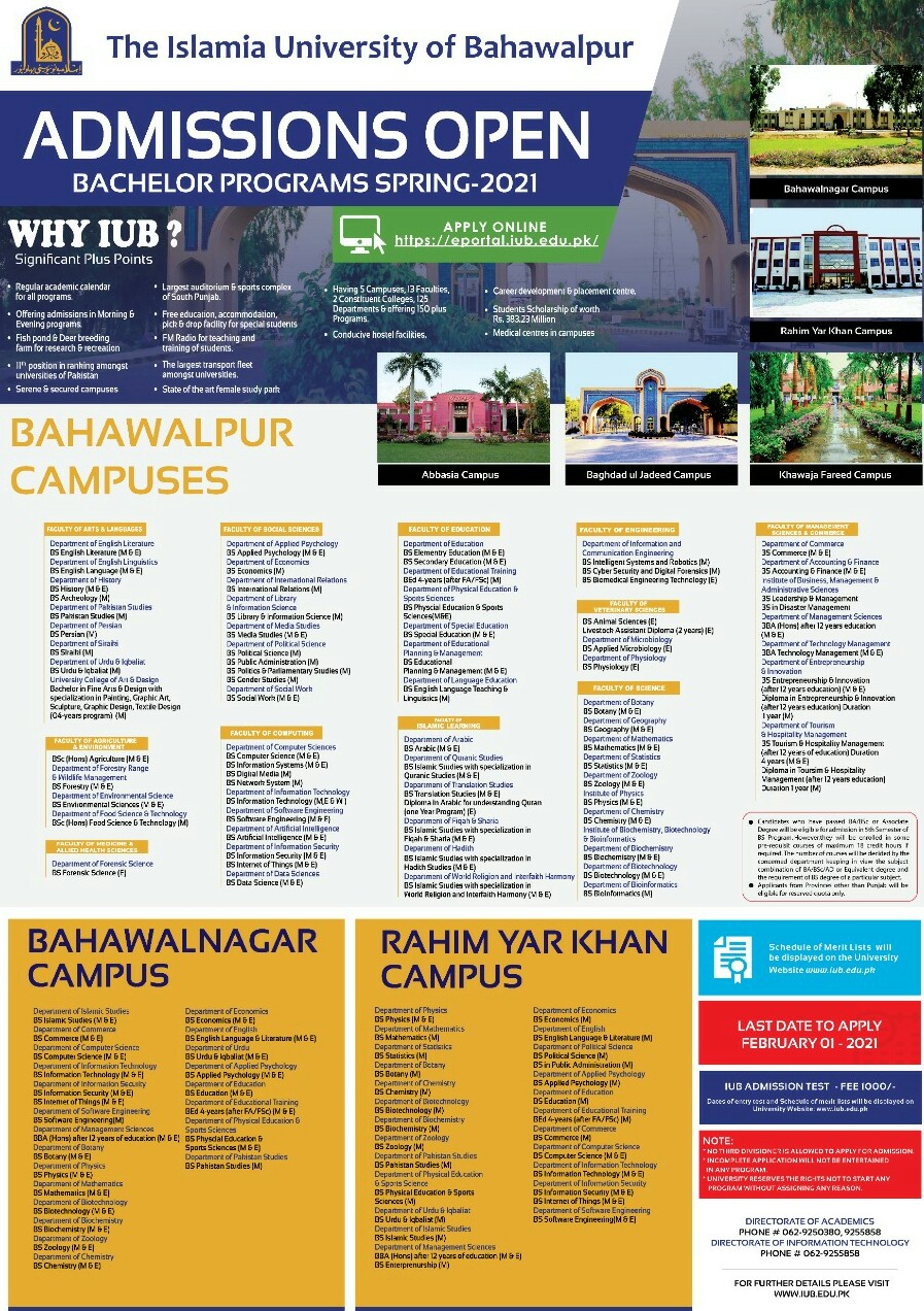 The Islamia University of Bahawalpur Offer/Open Admission & Merit List Schedule in Spring-2021